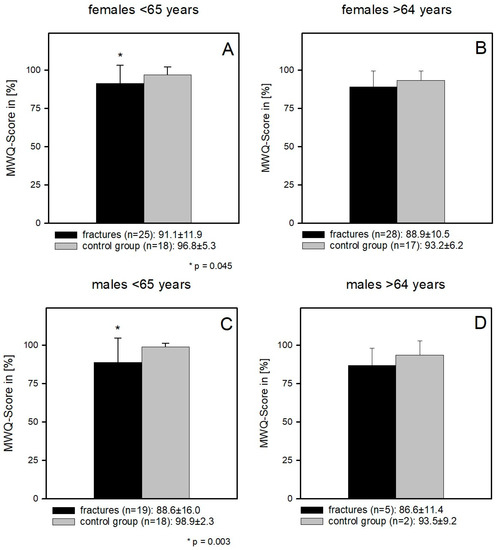 The male population had similar results (<65 years: 88.6 ± 16 and 98.9 ± 2.3; p = 0.003) and (>64 years: 86.6 ± 11.4 and 93.5 ± 9.2; p = 0.49) (Figure 6C,D).