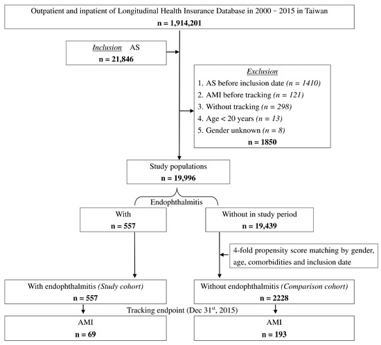 The International Classification of Diseases, Ninth Revision, Clinical Modification (ICD-9-CM) codes were used for patient selection from the two-million-level Taiwan LHID from the year 2000 to 2015. Patients diagnosed with AS, defined as coding with ICD code 720.0 (ankylosing spondylitis) at least once during hospital admission or no less than three times during outpatient visits, were selected into the study population. Patients that met the inclusion criteria were excluded if they were diagnosed with AS before the inclusion date, AMI occurred before tracking, there was a lack of tracking medical data, age was less than 20 years, sex was unknown, medical records or insurance status were incomplete, or the given codes were unrelated or incorrect. Patients within the study population and coded with endophthalmitis (ICD codes 360.0, 360.00–360.04, and 360.1) in their medical records were further identified as the study cohort. After the study cohort were identified, a four-fold comparison cohort were chosen from AS patients without endophthalmitis after matching with factors including sex, age, patient comorbidities, and the inclusion date. For all the study participants, the follow-up end points were the incidence of AMI (ICD code 410), withdrawal from the National Health Insurance Program, or tracking endpoint of the study (31 December 2015).