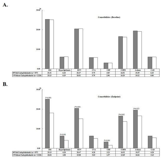 At the end of this study, 69 (12.39%) and 193 (8.66%) patients had AMI in the study cohort and the comparison cohort, respectively (p < 0.001). The mean ages of the study cohort and the comparison cohort were 40.53 ± 19.18 years and 41.33 ± 19.90 years, respectively. In addition, patients in the study cohort had a higher proportion of DM, hyperlipidemia, HTN, CHF, COPD, asthma, and higher CCI_R scores compared with the comparison cohort (see Table 1). The comorbidity bar graphs of the enrolled patients at baseline and endpoint are shown in Figure 2. Patients were followed up for an average of 9.91 ± 8.57 years, with no difference between AS patients with and without endophthalmitis (Table S2).