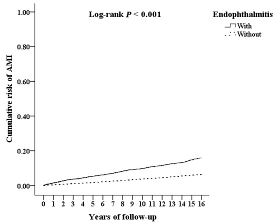 As shown in Table 3, the overall IRs of AMI were 1278.08 and 872.93 per 105 PYs in AS patients with and without endophthalmitis, respectively. The IR of AMI was reported to be 50.7 per 105 PYs in 2015 in Taiwan, which is much less than that in the AS population in our study [22]. This is consistent with previous study results that showed increased IRs of AMI in AS patients [23,24]. However, our study population was confined to newly diagnosed AS patients aged ≥20 years who had a complete medical record in the database, and the IRs were not age- and sex-adjusted in this study. Consequently, the epidemiological findings in our study required further research to clarify and need to be interpreted with caution.