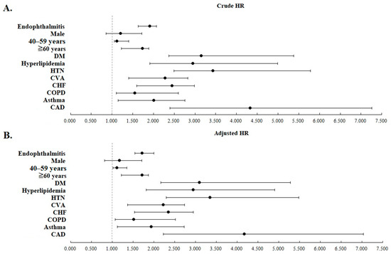 Our study included two cohorts matched with factors including sex, age, comorbidities, and inclusion date. At the study endpoint, significantly higher levels of DM, hyperlipidemia, HTN, CHF, COPD, and asthma were noticed in the cohort of AS patients with endophthalmitis. Despite many studies investigating preoperative, perioperative, and postoperative factors of endophthalmitis, no previous study has investigated the relationship between endophthalmitis episodes and the future incidence of comorbidities in AS patients. Furthermore, there was no difference in the all-cause mortality rates between the two cohorts. However, an increased mortality rate was found in endophthalmitis patients concurrently having renal disease, septicemia, pneumonia, tumors, and AS in our previous studies [16,17]. This controversial finding may be due to the retrospective study design and relatively small sample size of our database studies. As a result, the contribution of these factors to patient mortality must be further evaluated with a well-designed, prospective cohort study.