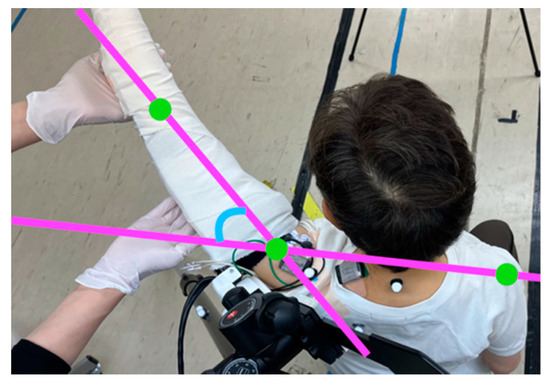 We set up the single-joint HAL in accordance with previous studies [5,6]. In brief, the proximal section of the HAL was fixed to a tripod using an attachment, and the distal section was fitted to the patient’s upper arm with a belt for the elbow joint, which was attached to the HAL (Figure 1a). The elbow was extended to its full range of motion (ROM); the forearm was placed in a slightly externally rotated position to prevent external rotation of the humerus and was immobilized near the wrist joint using a splint and bandage (Figure 1b). Flexion electrodes were placed on the skin of the anterior deltoid fibers and triggered for upper limb elevation. Instead of using the electrodes as triggers, relaxation of the shoulder flexor muscle and gravity functioned to trigger extension. The ground was placed on the bone touching the site where the bone was palpable, without interfering with the surface electromyography device.