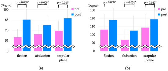 Shoulder joint ROM pre- and post-intervention. (a) Voluntary shoulder joint range of motion pre- and post-intervention, (b) passive shoulder joint ROM pre- and post-intervention. * Indicates p < 0.05. ROM, range of motion.