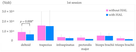 Comparison of surface EMG activity during upper limb raising before and after HAL application in the first training intervention. * p < 0.05. HAL, hybrid assistive limb.