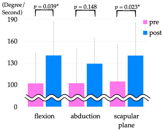 The maximum angular velocity during upper extremity elevation pre- and post-intervention showed a significant improvement in angle degree per second from 102.2 ± 41.6 to 140.7 ± 46.8 (p = 0.039) in flexion and from 104.9 ± 50.5 to 140.5 ± 45.3 (p = 0.023) in the scapular plane (Figure 6). We showed upper extremity elevation in Movies S1 and S2.