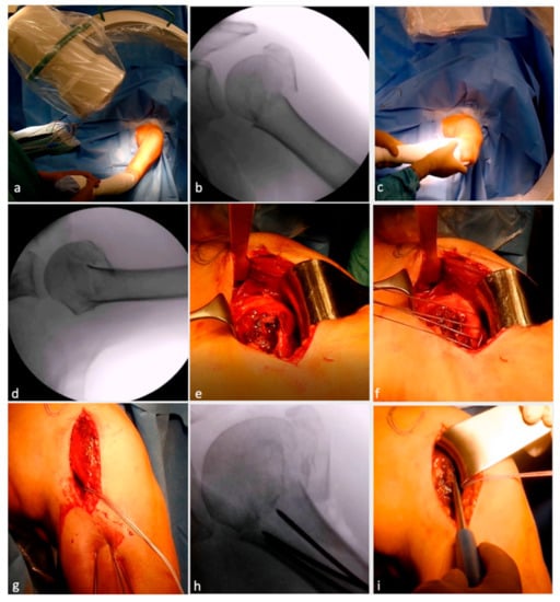 The surgery was performed by the previously published technique by Minkus et al. [40]. The surgery was performed in a beach chair position on a translucent table (Figure 1a), with the arm in a floppy position on a side table under general anesthesia and interscalene block. Each patient received intravenous antibiotics within 30 min of surgery. At the beginning of the procedure, the fracture was re-evaluated in a true a/p (Figure 1b) and axillary view (Figure 1c,d) using an image (radiographic) intensifier. A standard deltopectoral approach with an incision directly over the anterior portion of the deltoid muscle was used. Subsequently, the fracture was exposed, the hematoma was evacuated, the bursa was partially removed and a deltoid retraction hook (Innomed, Savannah, GA, USA) was inserted underneath the deltoid muscle for maximum exposure of the fracture lines between shaft, head and the greater tuberosity (Figure 1e). Depending on the age of the patient (taking into consideration his/her cosmetic demands), either a tenotomy or tenodesis of the long head of the biceps tendon was performed.
