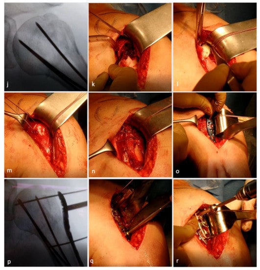 Following this, the head fragment was anatomically reduced (Figure 1i), especially the integrity of the medial buttress, using an image intensifier, and the K-wires were advanced into the humeral head until they reached the subchondral bone plate to retain the humeral head in position (Figure 1j). Next, the tuberosity fragments were reduced. Impacted fractures often entail a loss of bone stock at the lateral aspect of the humeral head. In these cases, one to two allografts were shaped and impacted into the fracture site to allow anatomical reduction of the tuberosity fragment and, hence, prevent a valgic displacement of the humeral head (Figure 1k,l). Depending on the age and functional and cosmetic demands of the patient, either a biceps tenotomy or tenodesis was performed (Figure 1m). Following successful visualization of anatomical reduction, the Fiber Wire sutures of the anterior and posterior cuff were tightened together (Figure 1n). The angular locking plate (PHILOS) was then introduced (Figure 1o), and the position of the plate was controlled using an image intensifier in true anterior–posterior view to avoid subacromial impingement. The plate was temporarily fixed with 1.6 mm K-wires proximally and distally, and the position was re-evaluated in an axillary view (Figure 1p). Before locking screws were inserted, the plate was temporarily fixed to the proximal humerus using a standard 3.5 mm cortical screw that was inserted into the center of the long shaft hole of the plate. Once the screw was inserted, the K-wires were removed. After pre-drilling (Figure 1q), the screws were meticulously placed from proximally to distally (Figure 1r). Two bicortical locking screws were inserted in the two most inferior plate holes. If support for the medial buttress was needed, one or two calcar screws were used to provide additional stability. Finally, the 3.5 mm cortical screw was exchanged for a locking screw. In very osteoporotic bone, drilling was performed under fluoroscopy since penetration of the drill into the joint would have been difficult to notice. The correct subchondral position of these screws was double checked by means of multi-plane fluoroscopy to avoid penetration of the screws into the glenohumeral joint. Thereafter, the three temporary K-wires were retrieved and the final construct was re-evaluated in internal and external rotation as well as abduction (Figure 1s–u) to evaluate plate impingement and stability.