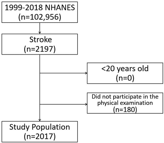 This analysis used cross-sectional data for NHANES respondents from 1999 to 2018 with a history of stroke who were aged ≥20 years. Respondents were asked if they had a history of a stroke diagnosed by a physician or other health professional. Self-reporting of strokes is a validated method in the general population and has been used in many large-scale epidemiological studies of stroke survivors [9]. Respondents who did not participate in the physical examination were excluded.