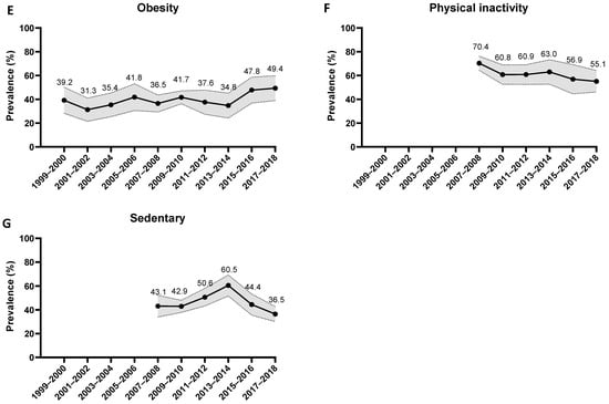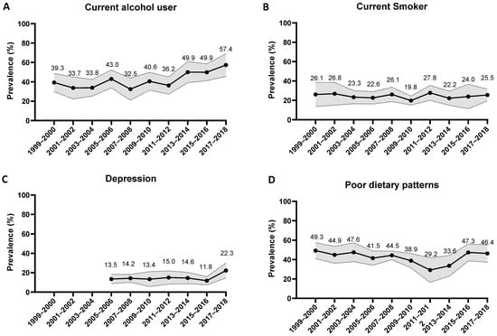 Smoking prevalence remained similar across the surveys. The age-adjusted estimated prevalence was 26.1% (95% CI: 13.7 to 38.6) in 1999–2000 and 25.5% (19.4 to 31.6) in 2017–2018, with an AAPC of 0.3% (−3.1 to 3.8; p = 0.865). The prevalence of current alcohol drinking significantly increased from 39.3% (29.8 to 48.7) to 57.4% (45.7 to 69.0) over the same period, with an AAPC of 4.9% (1.6 to 8.2; p = 0.008). Depression increased non-significantly from 2005–2006 to 2017–2018 (13.5% (8.6 to 18.4) 22.3% (14.6 to 30.0)), with an AAPC of 4.4% (95% −4.7 to 14.4; p = 0.277) and with most of the increase occurring from 2015–2016 (11.8% (7.4 to 16.1)). The prevalence of unhealthy diets (AHA Secondary score < 32) declined significantly, from 44.5% (32.4 to 56.5) in 1999–2000 to 29.0% (17.5 to 40.4) in 2011–2012 (APC: −5.9% (−10.1 to −1.5); p = 0.019), but then returned to the previous level in 2017–2018 (42.0% (31.4 to 52.7); APC: 9.0% (−7.1 to 28.1); p = 0.225). Obesity increased from 39.2% (28.3 to 50.2) in 1999–2000 to 49.4% (38.9 to 59.8) in 2017–2018, with an AAPC of 3.4% (0.4 to 6.4; p = 0.029). The prevalence of physical inactivity gradually decreased between 2007–2008 and 2017–2018 (70.4% (64.4 to 76.3) to 55.1% (46.1 to 64.2)), with an AAPC of −4.5% (−7.5 to −1.3; p = 0.017). Conversely, the prevalence of sedentary behavior non-significantly increased from 43.1% (34.0 to 52.2) in 2007–2008 to 60.5% (51.7 to 69.3) in 2013–2014 (APC: 14.2% (−46.7 to 144.6); p = 0.270) before decreasing to 36.5% (30.1 to 42.8) in 2017–2018 (APC: −21.5% (−84.6 to 301.6)), but with no statistical significance.