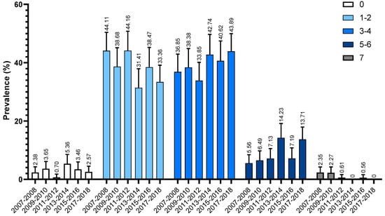 Changes in the unhealthy lifestyle score over time are shown in Figure 3. The proportion of patients with 7 unhealthy factors (maximum score; considered an extremely poor lifestyle) showed a gradual reduction over time, from 2.3% (0.4 to 4.3) in 2007–2008 to 0 in 2017–2018. The proportion with 5–6 unhealthy factors (poor scores) increased significantly from 5.6% (2.7 to 8.5) in 2007–2008 to 14.2% (9.3 to 19.1) in 2013–2014 (APC: 32.3% (6.1 to 65.1); p = 0.04), and then remained at a similar level in 2017–2018 (13.7% (9.5 to 17.9); APC:3.3% (−28.5 to 49.2); p = 0.463). The proportion with 3–4 unhealthy factors (intermediate scores) increased non-significantly over time, with an AAPC of 3.7% (−0.8 to 8.5; p = 0.085). The proportion with 1–2 unhealthy factors (good) decreased from 2007–2008 to 2017–2018, with an AAPC of −4.9% (−11.2 to 1.9; p = 0.116), but with no statistical significance. An “ideal” lifestyle was rare and was found in a similar proportion of respondents in each survey, with an AAPC of 3.2% (−27.2, 46.1; p = 0.82).