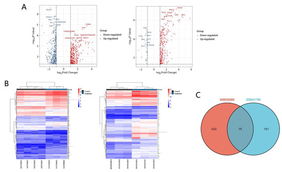 Volcano plots, heatmap and Venn of DEGs. (A) Volcano plot analysis identifies DEGs. Red dots represent up-regulated genes and green dots represent down-regulated genes. The differences are set an |log FC| > 1. (B) Heatmap of DEGs identified in two datasets. Red areas represent highly expressed genes and green areas represent lowly expressed genes. (C) Venn diagram of common DEGs from the two datasets. There are 75 common DEGs in the two datasets.