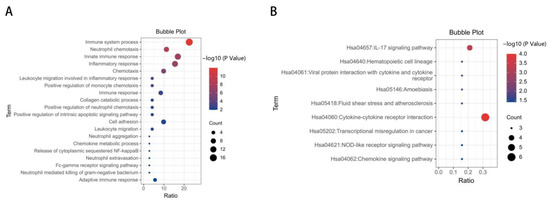 GO and KEGG enrichment analysis of DEGs. (A) Advanced bubble chart shows GO enrichment significance items of DEGs in biological processes. The x-axis label represents the gene ratio, and the y-axis label represents GO terms. (B) KEGG enrichment result of DEGs. The x-axis represents gene ratio and y-axis represents KEGG terms. The size of circle represents gene count. Different color of circles represents different adjusted p value.