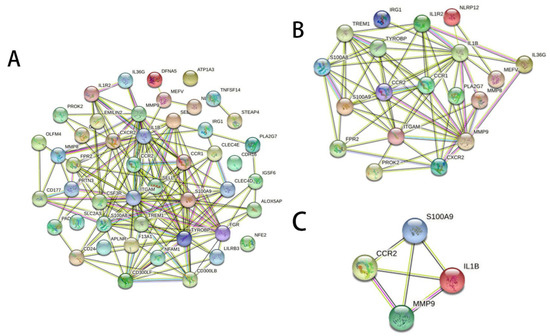 Gene interaction networks of DEGs. (A) PPI network of 47 DEGs which were homologous to the human counterparts. Nodes represent genes, edges represent interactions, and images inside each node represent the three-dimensional structure of each protein. (B) PPI network of the 19 inflammation-related DEGs. (C) PPI network of the four hub genes with the highest scores calculated by CytoHubba.