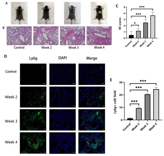 The change in fur appearance of the mice and the level of inflammatory cell infiltration in their lung tissue before and after irradiation. The mice in the control group did not receive irradiation, while the mice in the irradiation group were detected at 2, 3 and 4 weeks after irradiation. (A) After irradiation for 3–4 weeks, the back of mice showed hair loss. (B,C) H&E sections and inflammation scores of the lung tissues showed that inflammatory cell infiltration appeared in the lungs of irradiated mice with a time-dependent trend (bars, 200 μm). (D) Immunofluorescence of neutrophil Ly6g staining (green fluorescence) and DAPI nuclei staining (blue fluorescence) (bars, 20 μm). (E) Quantification of Ly6G (+) neutrophils per field of view. All graphs show the means ± SEM of at least three independent experiments. Statistical significance was analyzed by two-tailed t-test, * p < 0.05 and *** p < 0.001 compared to control.