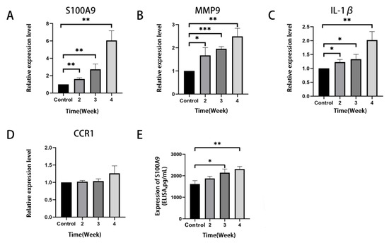 Verification of the expression level of the top four most significantly up-regulated DEGs in lung tissues of the mice before and after irradiation. The mice in the control group did not receive irradiation, while the mice in the irradiation group were detected at 2, 3 and 4 weeks after irradiation. (A–D) QRT-PCR validation of mRNA levels of S100A9, MMP9, IL-1β and CCR1 in mice lung tissues. The mRNA levels shown were the relative mRNA level compared to the mRNA level in the control group. (E) The level of S100A9 protein in BALF detected by ELISA. All graphs show the means ± SEM of at least three independent experiments. Statistical significance was analyzed by two-tailed t-test, * p < 0.05, ** p < 0.01, and *** p < 0.001 compared to control.