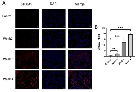Immunofluorescence stained of S100A9 in lung tissues. The mice in the control group did not receive irradiation, while the mice in the irradiation group were detected at 2, 3 and 4 weeks after irradiation. (A) Immunofluorescence staining of S100A9 (red) and DAPI (blue) in lung tissues from normal and RILI mice (bars, 20 μm). (B) Quantification of the positive signals in immunofluorescence images of S100A9. All graphs show the means ± SEM of at least three independent experiments. Statistical significance was analyzed by two-tailed t-test, ** p < 0.01, and *** p < 0.001 compared to control.