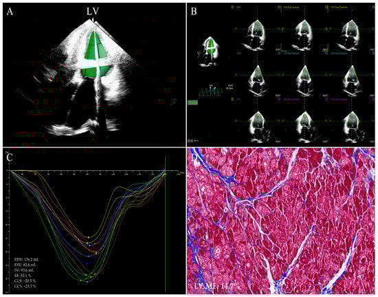 - Wang, J.; Zhang, Y.; Zhang, L.; Tian, F.; Wang, B.; Xie, Y.; Sun, W.; Sun, Z.; Yang, Y.; Lv, Q.; et al. Assessment of Myocardial Fibrosis Using Two-Dimensional and Three-Dimensional Speckle Tracking Echocardiography in Dilated Cardiomyopathy With Advanced Heart Failure. J. Card. Fail. 2021, 27, 651–661. [Google Scholar] [CrossRef]