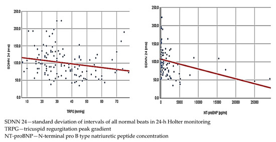Correlations in all low and intermediate risk patients with acute pulmonary embolism (n = 162) between standard deviation of intervals of all normal beats in 24 h Holter monitoring and tricuspid regurgitation peak gradient (r = 0.22, p = 0.016)—left side of the figure—and N-terminal pro-B type natriuretic peptide concentration (r = −0.30, p = 0.004)—right side of the figure.