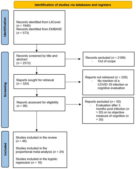 The main criterion for identification was a cognitive assessment carried out during the acute phase of COVID-19. First, two independent reviewers (ANC and IJA) screened all the titles and abstracts of the articles found on the search engines. Both were involved in the selection process that was then confronted (Cohen’s kappa = 0.45; agreement = 90.52%) and disagreement was handled through discussion. Only articles that reached an agreement were retrieved. The identified articles were then split between the two reviewers and read in their entirety. Each reviewer extracted the data from half of the articles identified, focusing on cognitive data, sociodemographic data, type of hospitalization, comorbidities, psychiatric data, brain imaging, and results of confirmatory tests (either nucleic acid or serology) for COVID-19. All data included in the meta-analysis were double checked by the two reviewers.