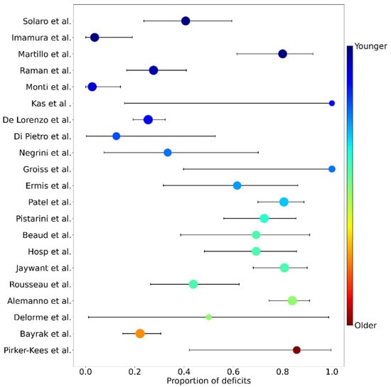 Forest plot of proportions of cognitive deficits for each study, as measured by global scales. Studies are sorted in increasing (from top to bottom) average age (from 54 to 78 years old). Dot sizes are proportional to the random effect weight, whiskers are the 95% confidence interval (both based on the sample size) and colors represent the average age (blue: younger; red: older). Studies are identified by their first author (y axis) and correspond to the following publications (from top to bottom): Solaro et al. []; Imamura et al. []; Martillo et al. []; Raman et al. []; Monti et al. []; Kas et al. []; De Lorenzo et al. []; Di Pietro et al. []; Negrini et al. []; Groiss et al. []; Ermis et al. []; Patel et al. []; Pistarini et al. []; Beaud et al. []; Hosp et al. []; Jaywant et al. []; Rousseau et al. []; Alemanno et al. []; Delorme et al. []; Bayrak & Cadirci []; Pirker-Kees et al. [].