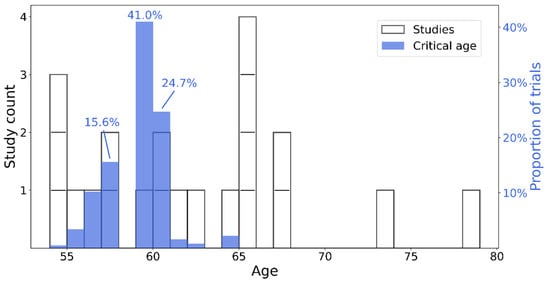 Histogram of age distribution of studies (white–left y axis) and critical age estimation (blue–right y axis). Individual studies are shown as white bar segments. The top three more frequent critical ages, as estimates in the bootstrap process, are highlighted by their respective percentage of positive identification throughout the 1000 trials.