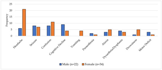 The presenting features of patients were variable, with onsets over days to months. Common symptoms at presentation included headache, seizure and confusion; however, these occurred at different rates between males and females. In females, the most common symptom was headache, occurring in 62% (21/34) of females and only 27% (6/22) of males, respectively (Figure 1) (p = 0.006). Cognitive decline was the most commonly reported symptom in male patients, ranging from confusion to coma, being reported in 41% (9/22) of cases versus 12% (4/34) of females (p = 0.99). Overall features of vomiting and focal neurology were rarely reported. Importantly, constitutional symptoms were not described in any of the identified cases. Of those patients who died, headache was the most predictive, present in 64% (16/25) of patients (p = 0.02).