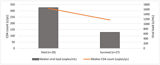 Only 18 patients had a peripheral CD8 count measured at presentation, with a median value of 888 cells/µL (range: 360–2001 cells/µL). When considering serum investigations where available by outcome (47/57), those who died (20/47) had higher peripheral viral loads (median: 1676 copies/mL) versus those who survived (median: 660 copies/mL) (p = 0.72). Patients that died demonstrated higher CD4 counts (median: 320 cells/µL) than those who survived (median: 227 cells/µL) (p = 0.079) (Figure 2).