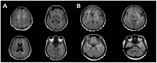 MRI brain images demonstrating the characteristic features in CD8E. (A) bilateral periventricular deep white matter changes with high signal involving both temporal lobes on axial T2 FLAIR sequences. (B) axial T2 FLAIR sequences revealing diffuse non-restricting T2 hyperintensities throughout the white matter involving the pons, temporal poles, insulae and periventricular white matter (with permission from Kerr et al. [19]).