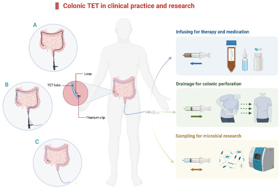 The concept of TET was first reported in 2015 [12]. The main clinical applications of colonic TET are shown in Figure 1. A tiny and soft TET tube should be inserted into the deep colon with endoscopic guidance. After that, the endoscope is removed from the colon while the TET tube is maintained at the target location. Then, the endoscope is re-inserted to fix the TET tube in place [12,19]. The colonic TET tube (FMT medical, Nanjing, China) has three separate loops attached to the tube: the first, second, and third site/station. The first loop is fixed to the proximal end of the colon, 10 cm away from the subsequent loop [19]. Each line-loop on the tube is used to fix the tube to the intestinal wall with one or two endoscopic clips (e.g., ROOC-D-26-195-C, ≥10 mm, Nanjing Microtech Co.; HX-610-135 L, 135°, Olympus). The location and number of clips are based on the mucosal folds, disease severity, and duration for which the tube needs to be retained. Generally, 1–2 clips at the first site and 0–2 clips at the second and/or third site (as required) are recommended [12,19,20]. A previous study indicated that using more than four clips had no extra benefit in prolonging the maintenance time of the TET tube [19]. There is a guide wire within the tube for colonic TET, which is removed from the distal TET tube when the colonoscope is withdrawn from the intestine. Subsequently, the TET tube outside the anus is fixed to the hip lubricated with paraffin.