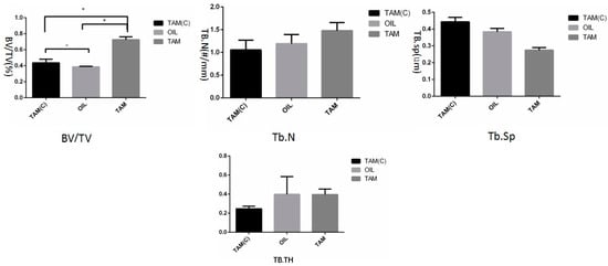 Analysis of skull bone mass index. The BV/TV of the TAM group is significantly higher than that of the Oil group and the TAMc group (p < 0.05): Tb.N tends to increase, Tb.Sp tends to decrease, and Tb.TH has no statistical difference. * means p < 0.05.