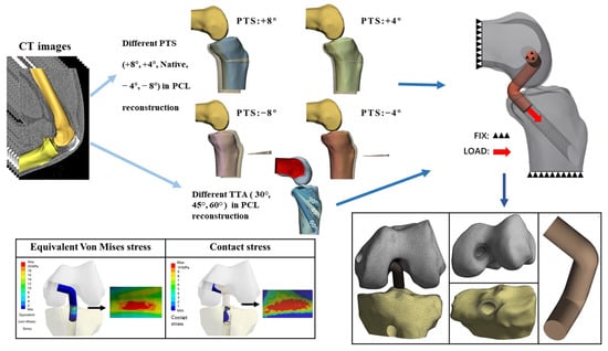 Several limitations associated with the present study warrant mentioning. First, the surgical method in our model was created utilizing the CAD software program, therefore the findings may be different from those obtained in actual clinical practice. Second, the study specified linear, isotropic, and homogeneous material properties to simplify the knee model. Therefore, other potential factors that may affect knee stability after PCL reconstruction were not considered. Third, in the present study, we only evaluated how the different TTAs and PTSs affected the “killer turn” effect when the knee flexion angle was 90°. Therefore, the influence of the PTS and TTA on the “killer turn” area in different knee flexion angles was not assessed. Finally, the present study was conducted using data from a single healthy subject. The subject’s specific knee morphologies were likely to affect the results.