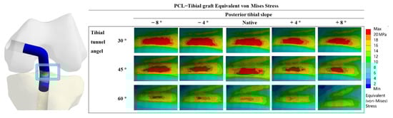 Furthermore, this is the first FEA study to propose the use of aOW-HTO to create a larger PTS combined with a large TTA to attenuate the “killer turn” effect during PCL reconstruction. Our results showed that the peak of the VMS in the PCL grafts in the model with a +8° PTS and 60° TTA was much lower than that in the model with a −8° PTS and 30° TTA (Figure 3). The combination of aOW-HTO and the creation of a large TTA during PCL reconstruction may be associated with perioperative complications such as knee joint infection and postoperative delayed recovery [48]. Further studies will be required to validate the safety and usefulness of this combined procedure in a clinical setting.