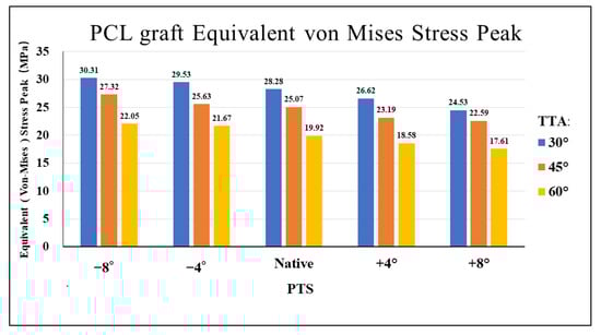 Bar chart of equivalents (Von Mises) stress peak diagrams for different TTAs and PTSs at the entrance of the tibial tunnel. TTA: tibial tunnel angle, PTS: posterior tibial slope.