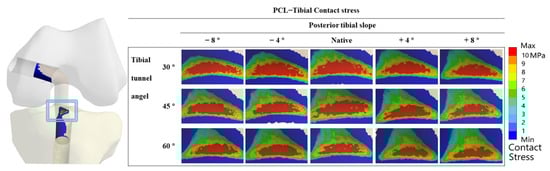 The PCL graft and tunnel are subjected to substantial mechanical stress at the “killer turn” area [49]. Several researchers have reported that the “killer turn” area may contribute not only to graft wear but also to tunnel volume enlargement (TVE) [12,50], and that this may be a major cause of failure of PCL reconstruction [16]. In the present study, the tibial tunnel was created at the anatomical tibial footprint of the PCL. The cancellous bone is reportedly more widely distributed than the thin cortex at the proximal tibia [43]. In some animal studies, the amount of cancellous bone around the ACL graft was found to significantly influence graft-to-bone healing [51]. Therefore, in the present study, a “high-contact stress area” (contact stress greater than 10 MPa) was evaluated at the “killer turn” area of the tibial tunnel. According to the study findings, the “high-contact stress area” decreased when the TTA and PTS increased. Kwon et al. reported that the mean femoral and tibial tunnel enlargements were 10.1–13.8% and 9.9–10.1%, respectively, 1 year after PCL reconstruction [50]. TVE can cause posterior knee laxity after PCL reconstruction [52]. Persistent posterior knee laxity is a factor that can lead to knee osteoarthritis [53].