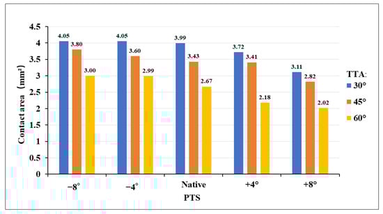 Figure 4 shows the contact stress at the “killer turn” in each model. The results of the “high-contact stress area” (contact area of the contact stress greater than 10 MPa) are shown in Figure 5. The “high-contact stress area” decreased when the PTS angle increased in the same TTA model, and the “high-contact stress area” decreased when the TTA increased in the same PTS model.