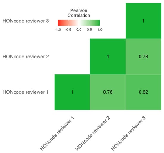 Heat map of the correlation between the HONcode scores of the three reviewers.
