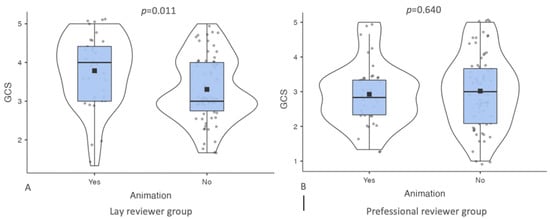 The presence of animations significantly influenced the GQS score expressed by the lay reviewers (animation 4 (IQR 1.42) versus no animation 3 (IQR 1.25); p = 0.011) but not that of the professionals (animation 2.83 (IQR 1) versus no animation 3 (IQR 1.58); p = 0.640) (see Figure 3).