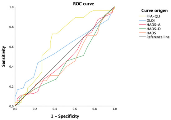Receiver operating characteristic (ROC) curve to assess discriminative power differences between scales to select severe FFA. The FFA-QLI showed higher discriminative power to discriminate patients with severe FFA, compared to all the other questionnaires, the DLQI, HADS, HADS-A, and HADS-D.