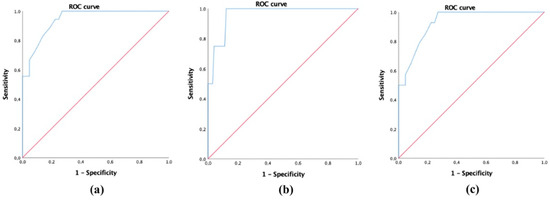 To select patients with mild, moderate, and severe QoL impairment, cut-off points were delimited by comparing the values for the FFA-QLI and DLQI. The DLQI was used because it yielded the best correlation values. The ROC curve analysis showed that values lower than 21 in the FFA-QLI corresponded to patients with low QoL impairment, with a sensitivity of 88.9% and a specificity of 80.7% (AUC = 0.942, p < 0.001) (Figure 2a). To select patients with greater QoL disorder, it was proposed that the cut-off point be 35, with a sensitivity of 75% and a specificity of 95.9% (AUC = 0.961, p = 0.002) (Figure 2b). The separation between the categories of mild and moderate was proposed at a cut-off point of 21, with a sensitivity of 85.7% and specificity of 80.7% (AUC = 0.929, p < 0.001) (Figure 2c).