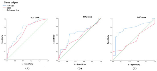Receiver operating characteristic (ROC) curve to assess discriminative power differences between scales to select (a) long-lasting cases of FFA, (b) patients with facial papules, and (c) patients with eyebrow alopecia. The FFA-QLI showed higher discriminative power than the DLQI to discriminate patients with long-lasting FFA (a) and eyebrow alopecia (c). However, although the FFA-QLI had more power to select patients with facial papules than the DLQI (b), it did not have enough power to do so.