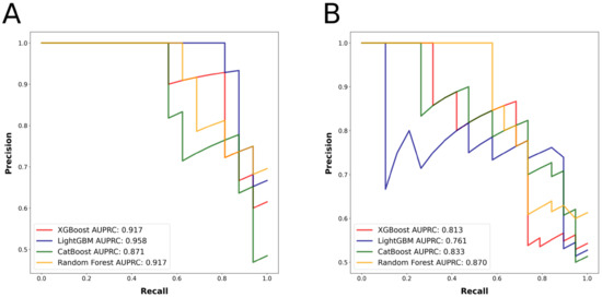 (A) Algorithms’ precision-recall curves for the outcome mRS at 90 days. (B) Algorithms’ precision-recall curves for the outcome NIHSS shift.