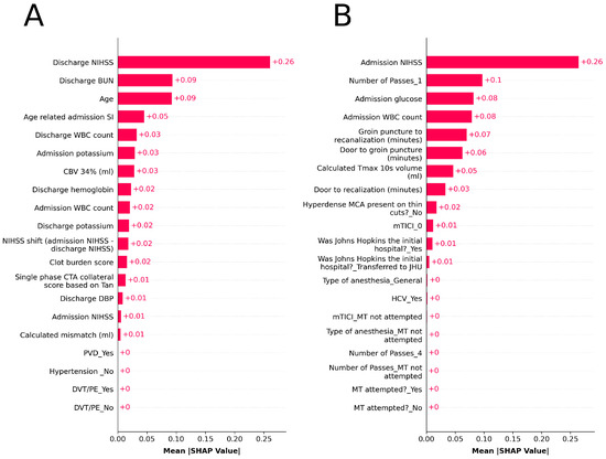 Sorted feature importance and their mean SHAP values (A) for the model predicting the mRS at 90 days with the LightGBM algorithm, (B) for the model predicting the NIHSS shift with the Random Forest algorithm.