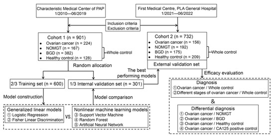 Diagnosis using a combination of multiple indicators is an effective method to address the shortcomings of single tumor markers. Among them, the generalized linear model, represented by logistic regression (LR) analysis and Fisher’s linear discriminant (FLD), tends to be more accurate than mechanical parallel or tandem diagnoses in ovarian cancer [6,7]. Laboratory tests combined with CA125 focus on serum tumor markers, such as human epithelial protein 4 (HE4), CA15-3, CA724, and carcinoembryonic antigen (CEA), while ignoring the potential value of more abundant blood routine, blood biochemistry, and other test data. As a branch of artificial intelligence (AI) technology, machine learning algorithms are rapidly emerging in the field of medical diagnosis given their ability to uncover hidden information and intrinsic associations among multiple variables. Medical AI systems grown out of machine learning have advantages over conventional statistical approaches in integrating enormous amounts of feature indicators, coping with missing data and iterating performance in multiple centers [8]. In recent years, with the development of liquid tumor biopsy technology, machine learning has mainly been used to analyze high-dimensional nonlinear data, such as mass spectra and gene sequencing of ovarian cancer samples [9,10,11]. Although data from routine tests was more easily available to all clinicians, taking into account a disease as heterogeneous as epithelial ovarian cancer with complex change pattern in laboratory indicators, prediction of ovarian cancer driven by conventional laboratory indicators has not been reported frequently. Moreover, past encouraging performance of AI systems for ovarian cancer concentrated mainly on classification of histologic subtypes [12,13] as well as prediction of survival, recurrence, and response to treatment [14,15,16]. The application of AI in screening ovarian cancer from a real-world cohort with diverse disease needs further investigation.