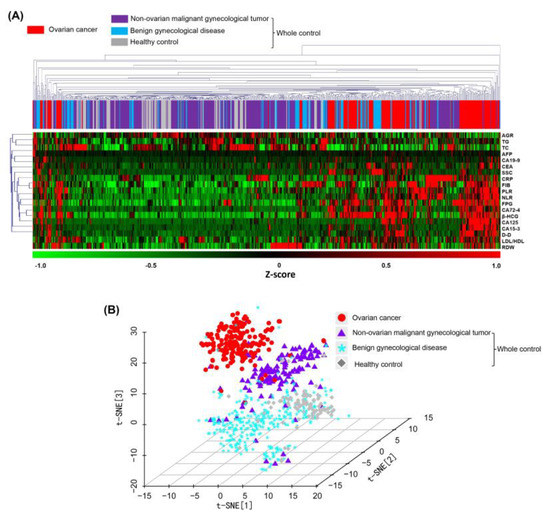 Systematic clustering analysis and t-distribution random-domain embedding (t-SNE) dimensionality reduction were performed directly on samples using laboratory metrics from cohort 1. This was used to demonstrate the spatial distribution of samples after feature transformation for preliminary evaluation of the effectiveness of linear and nonlinear two-class treatment models in distinguishing the ovarian cancer group from the control group.