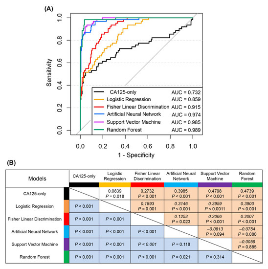The classification results of the CA125-only model, two linear models, and three nonlinear models were compared. As shown in Table 2, by combining the evaluation metrics of AUC, sensitivity, specificity, positive predictive value, negative predictive value, and accuracy, the diagnostic efficacy was ranked, from highest to lowest, in the following order: RF, SVM, ANN, FLD, LR, and CA125-only. The traditional method of using CA125-only for diagnosing ovarian cancer performed poorly, with an accuracy rate of only 73.0%. The various linear and nonlinear models using multiple test results improved the accuracy to more than 80% and 90%, respectively, and the diagnostic efficacy of the nonlinear models was generally better than that of the linear models.