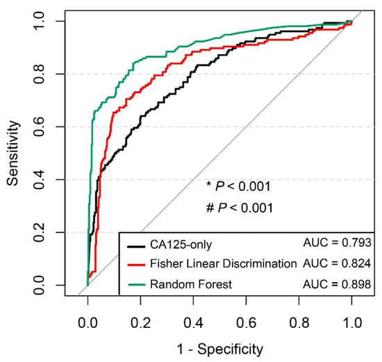 Receiver operating characteristic (ROC) curves of the preferred linear versus nonlinear models for the diagnosis of ovarian cancer. Note: * Area under the ROC curve (AUC) of random forest compared with AUC of Fisher’s linear discriminant model; # AUC of random forest compared with AUC of CA125-only.