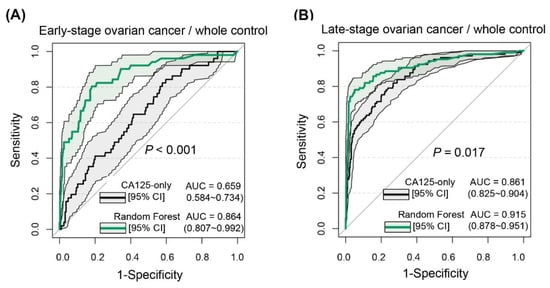 Receiver operating characteristic curves for different stages of ovarian cancer diagnosed by random forest. (A) Early-stage (International Federation of Gynecology and Obstetrics (FIGO) stages I–II) ovarian cancer versus overall control group. (B) Advanced-stage (FIGO stages III–IV) ovarian cancer versus overall control group.