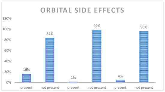 Preoperative side effects (diplopia, enophtalmos, exophthalmos) were evaluated through accurate ophthalmic clinical examinations by the same operator and using the same instrument (Hertel Exophthalmometer, © 2022 Lombart Instrument, Inc. All Rights Reserved. 800-LOMBART, 5358 Robin Hood Road, Norfolk, Virginia 23513). In the same way, all patients took the Hess-Lancaster screen or Hess-Lancaster red-green test to better diagnose any defect in ocular motility. The considered variables were summarized considering frequency and percentage for each category.