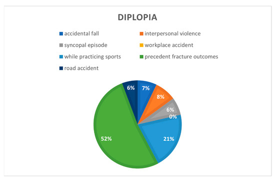 Correlating the cause of the trauma and the orbital complications (Figure 4), it was found that, in the studied cohort, 100% of diplopia cases were present in patients who had previously undergone surgery for orbital wall fractures (n = 14), 40% while practicing sports (n = 4), 15% occurred in interpersonal violence cases (n = 10), 14% in accidental fall cases (n = 20), 13% in syncopal episode cases (n = 10) and 11% in road traffic accident (n = 16), while none occurred in a workplace setting.