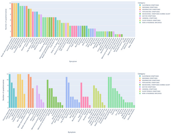 Number of symptoms identified in the 12 selected self-reported multiple sleep disorder screening questionnaires in adults. (Top) Organized from the most frequent to the least frequent for all categories of sleep symptoms. (Bottom) Organized from the most frequent to the least frequent regarding the category of sleep symptoms as identified previously [2,3,5].